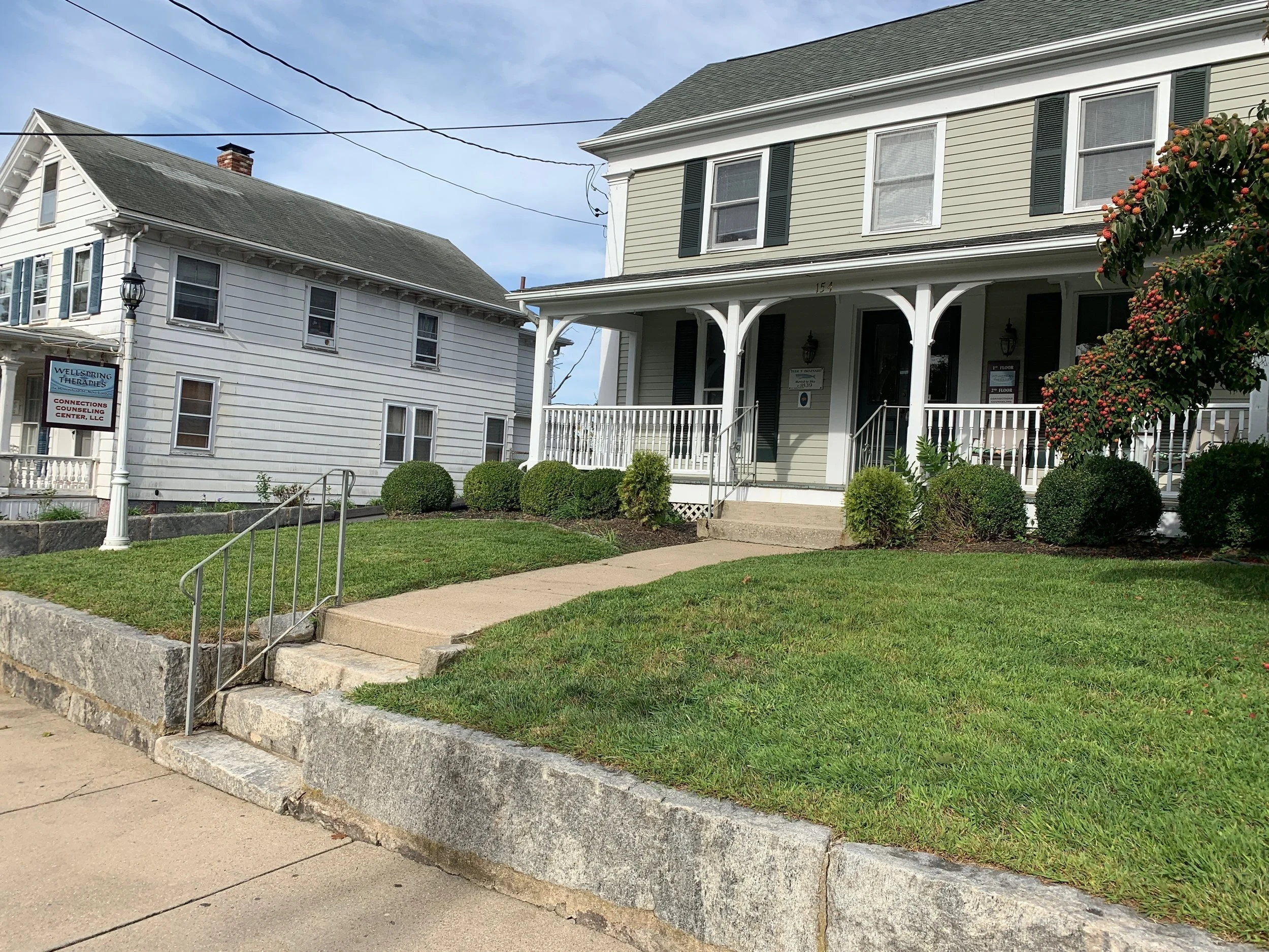 The office is in a building that looks like a home and has a sign out front that says Connections Counseling and New London Natural Health Center.